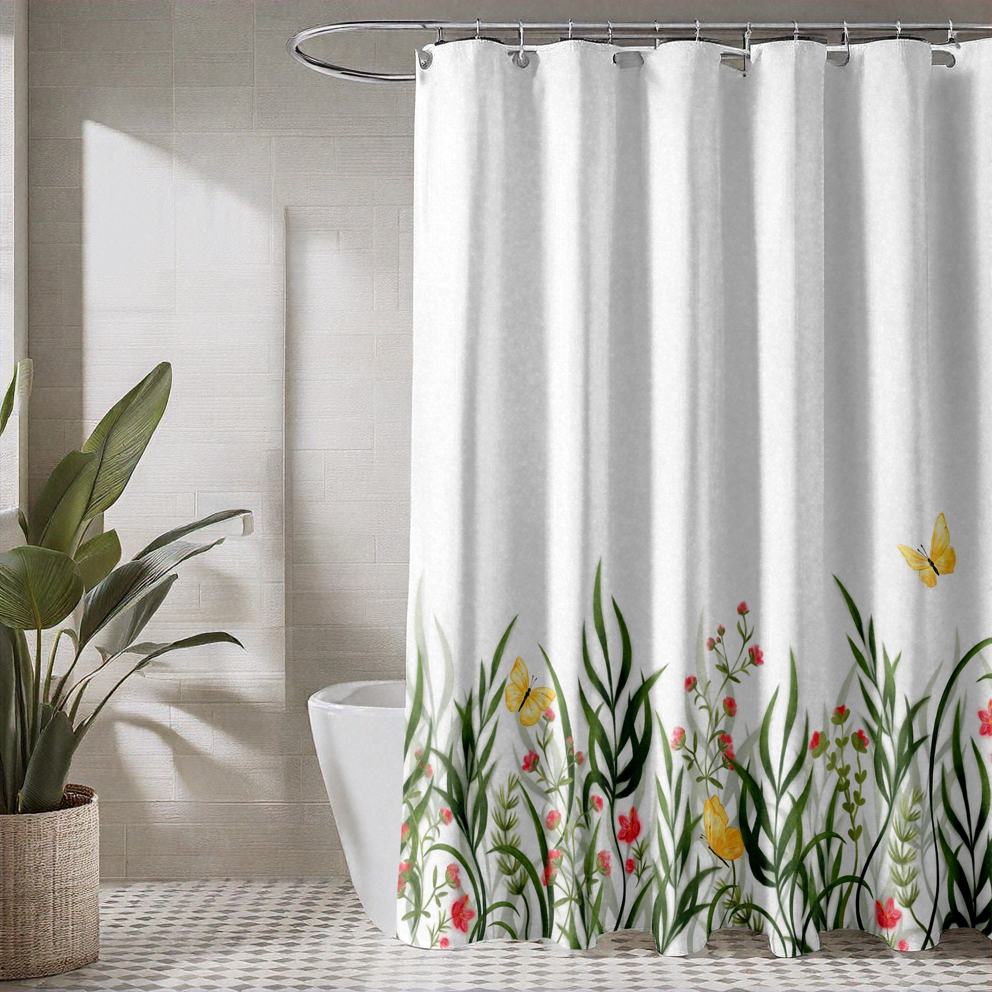 Simplicity meets elegance in this understated yet whimsical bathroom shower curtain designed with original nature-inspired watercolor style artwork with grasses, soft tulips, and fluttering yellow butterflies hand-drawn in a natural, ethereal haze on a crisp white background. Its minimal aesthetic brings a clean, serene look to your bathroom while subtly celebrating the beauty of nature. Ideal for modern, farmhouse, or traditional bathrooms. Made with easy-care, quick-dry, machine-washable fabric. Can be used as a shower curtain, shower curtain liner, or both. Hangs on shower curtain rod through 12 grommets (hangers not included).