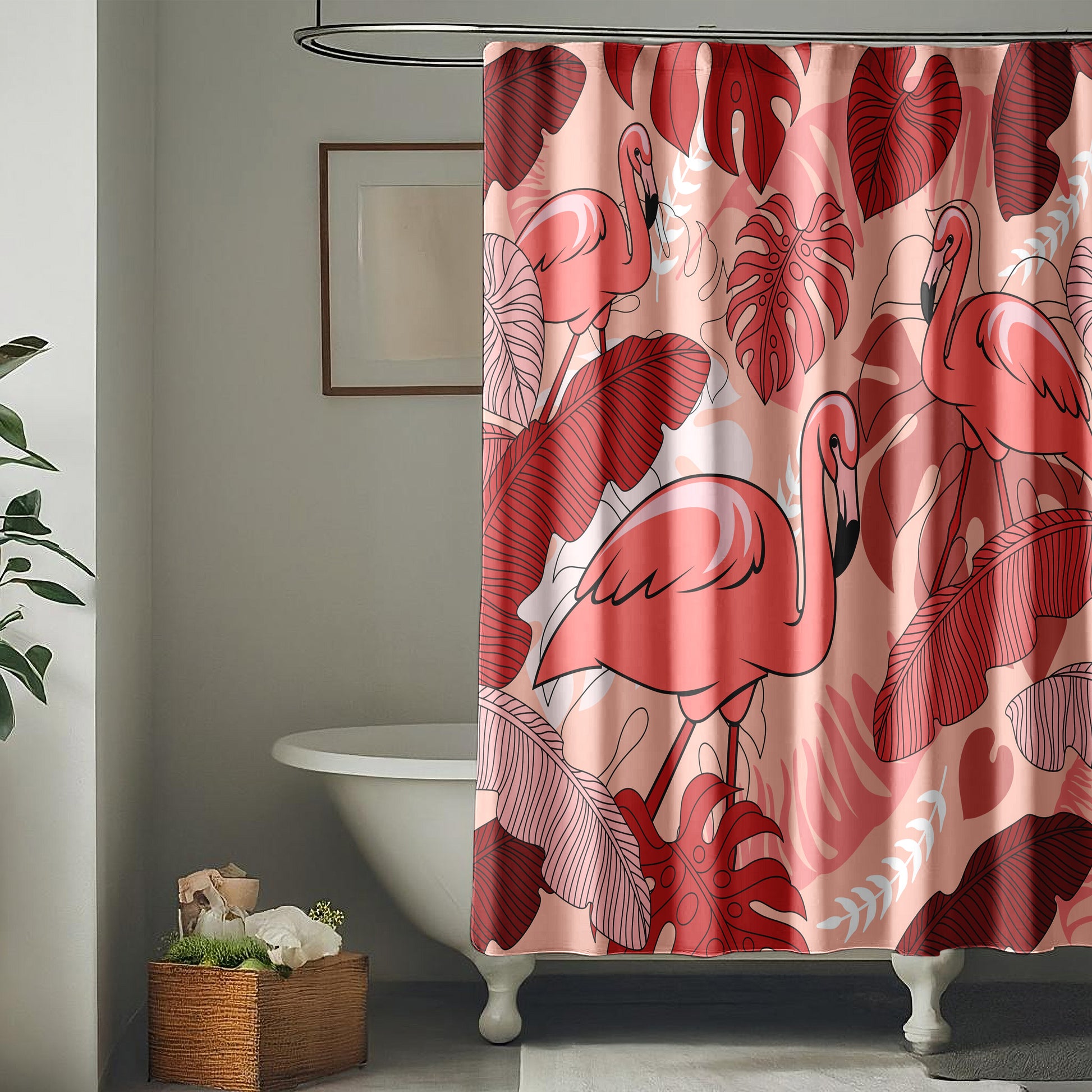Monstera Leaf Fabric Shower Curtain for Bathroom with Tropical Pink Flamingo, Warm Red and White Monstera and Banana Leaf Design on Fabric | Quick Drying, Water-Repellent, Machine Washable Shower Curtain