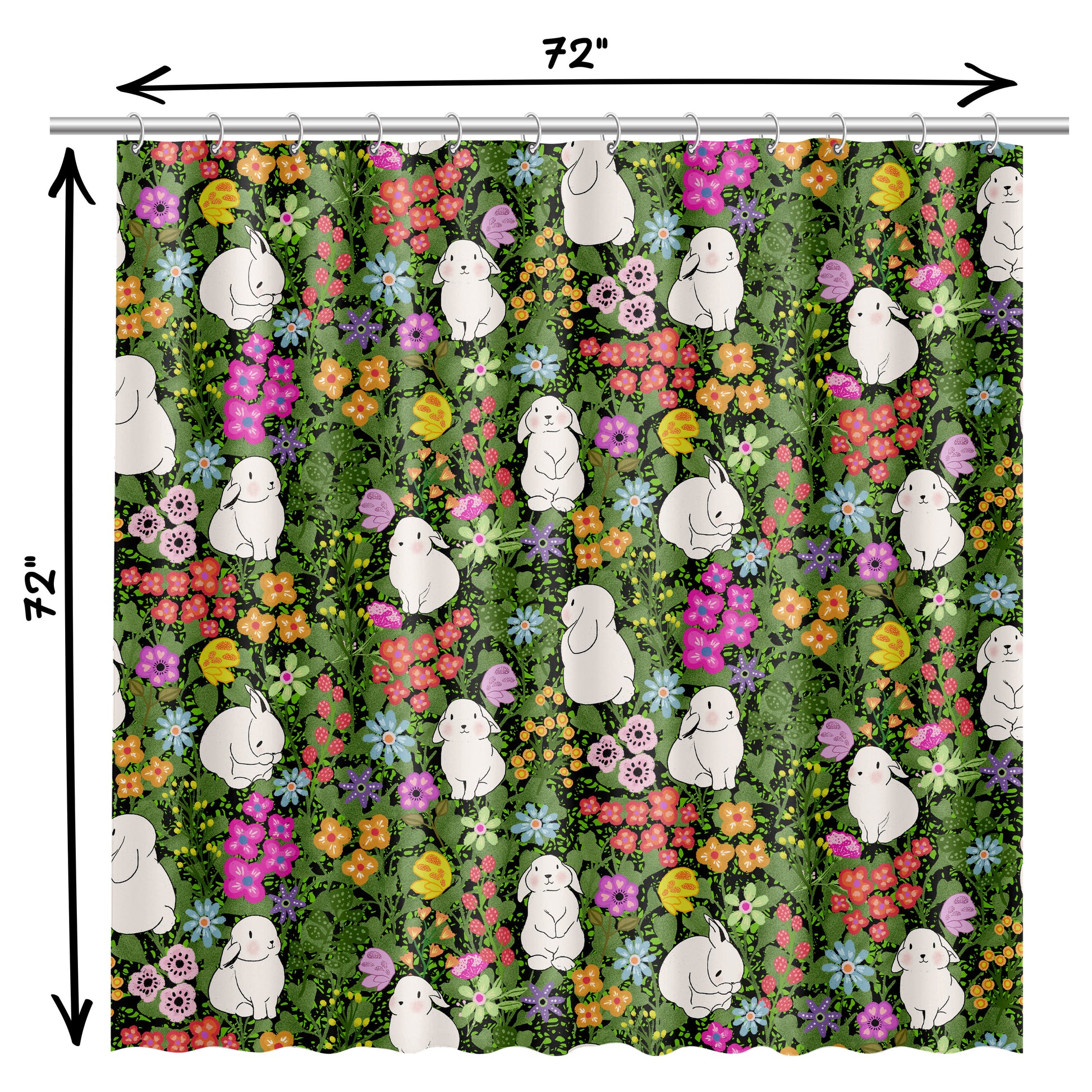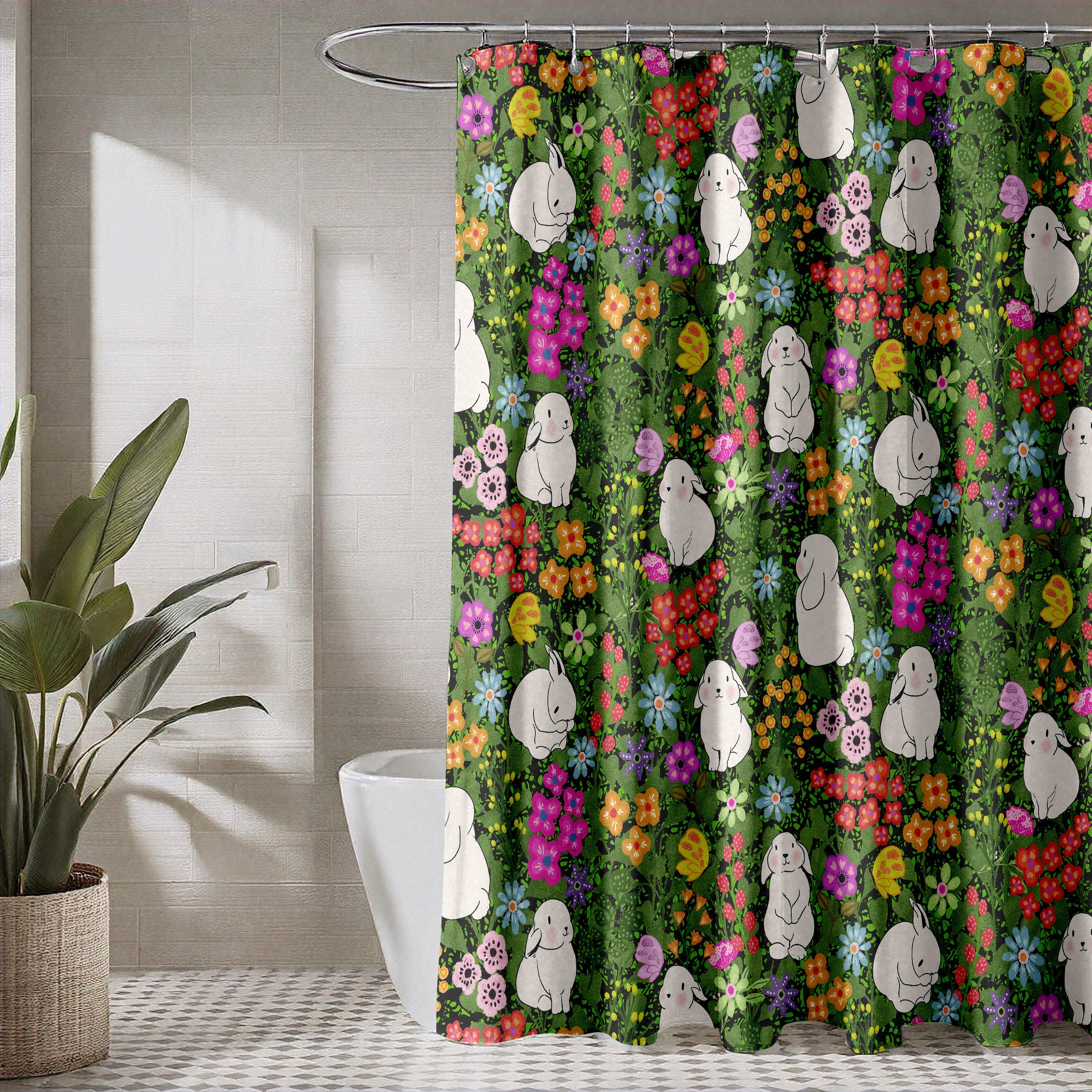 Shower Curtain for Bathroom with Whimsical Butterflies, Adorable Bunnies, Cute Floral Design, and Bright Spring Colors on Green Fabric | Quick Drying Water-Repellent Machine Washable Fabric Shower Curtain