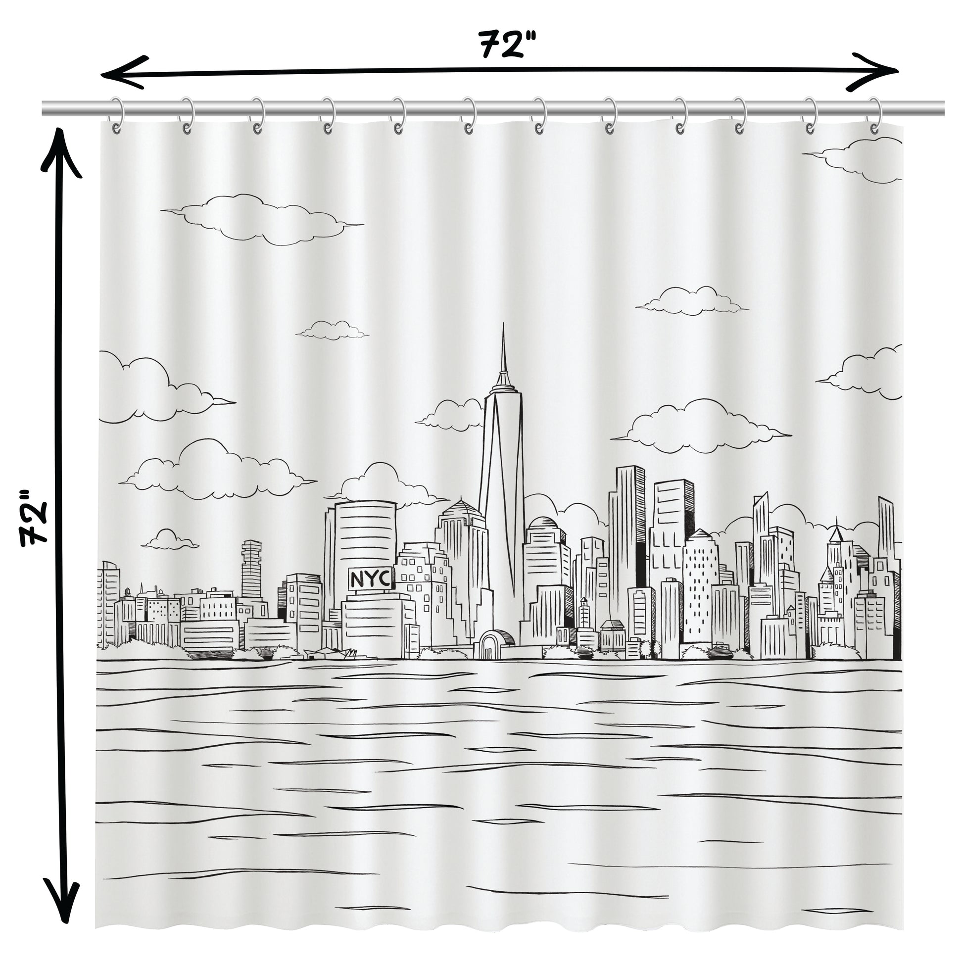 - 72 x 72 inch white fabric shower curtain featuring original NYC skyline artwork by NYwC that can accommodate most standard shower setups